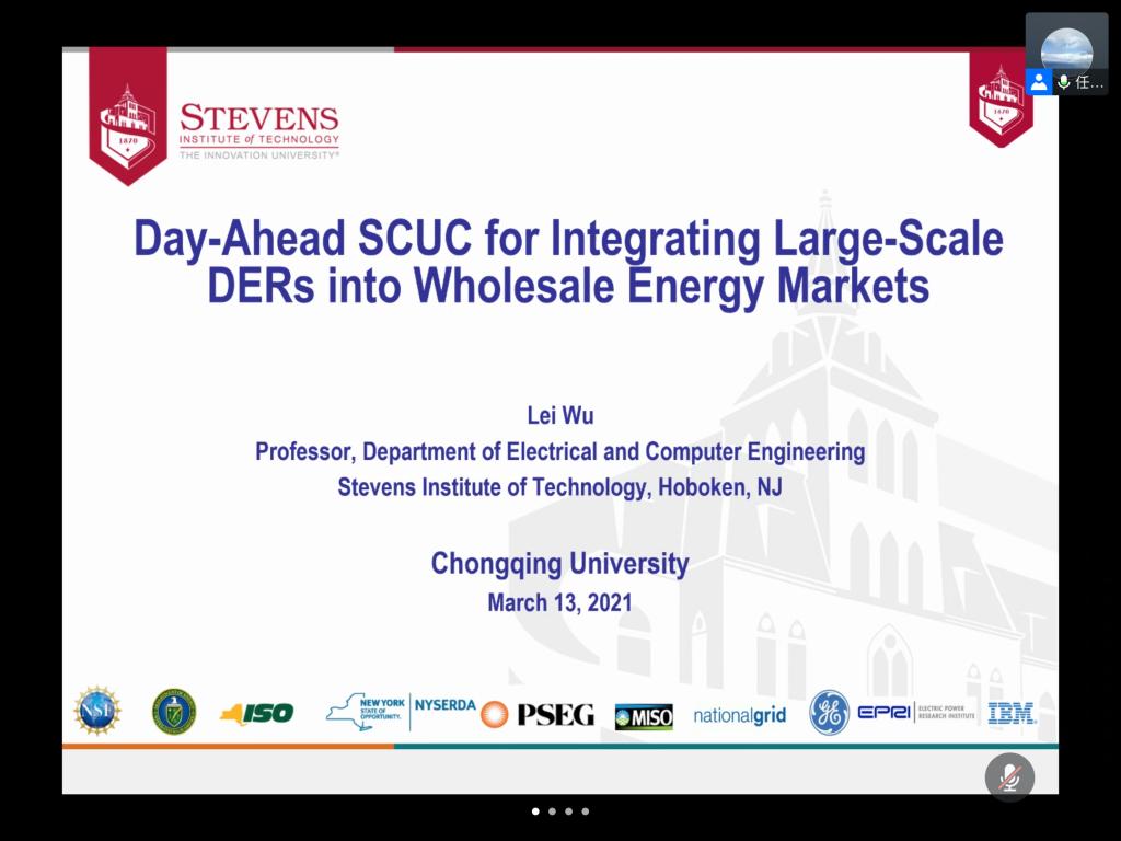 2021年3月14日上午,斯蒂文斯理工学院吴磊教授受邀做客“智慧能源云讲堂”,担任第八期的主讲嘉宾,以“Day-Ahead SCUC for Integrating Large-Scale DERs into Wholesale Energy Markets”为主题开讲。本期学术讲座由91黄色网站 、输配电装备及系统安全与新技术国家重点实验室、重庆市电机工程学会联合举办,由学院院长助理任洲洋主持。报告正式开始前,任洲洋老师代表学院对吴教授参与“云讲堂”表示热烈欢迎,并...