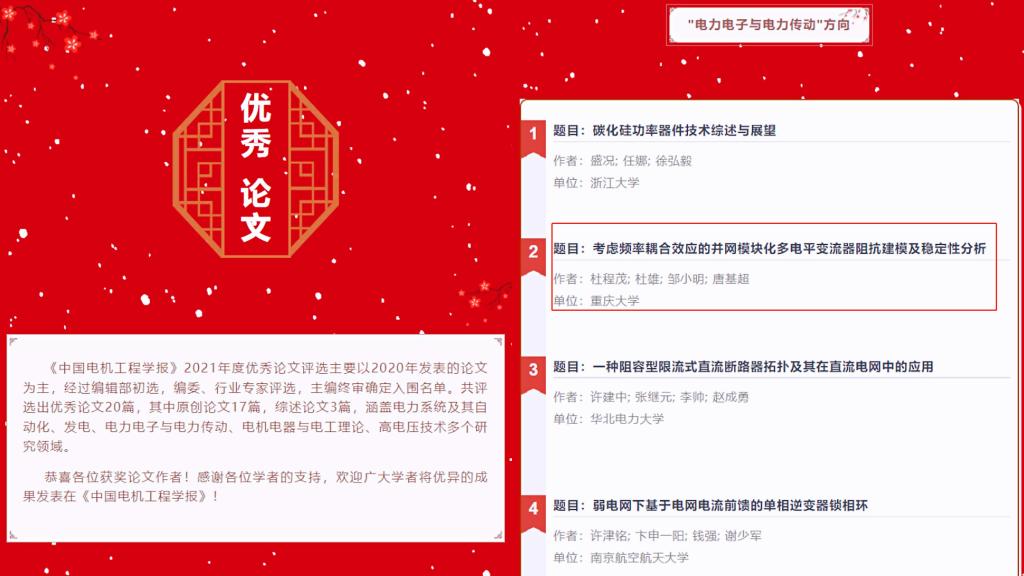 近日,《中国电机工程学报》经过编辑部初选,编委、行业专家评选,主编终审确定入围名单。共评选出优秀论文20篇,其中原创论文17篇,综述论文3篇,涵盖电力系统及其自动化、发电、电力电子与电力传动、电机电器与电工理论、高电压技术多个研究领域。我院杜雄教授针对模块化多电平变流器并网稳定性开展了深入研究,通过揭示变流器与电网之间的频率耦合效应,建立等效阻抗模型,准确评估了模块化多电平变流器并网系统的振荡风险,...