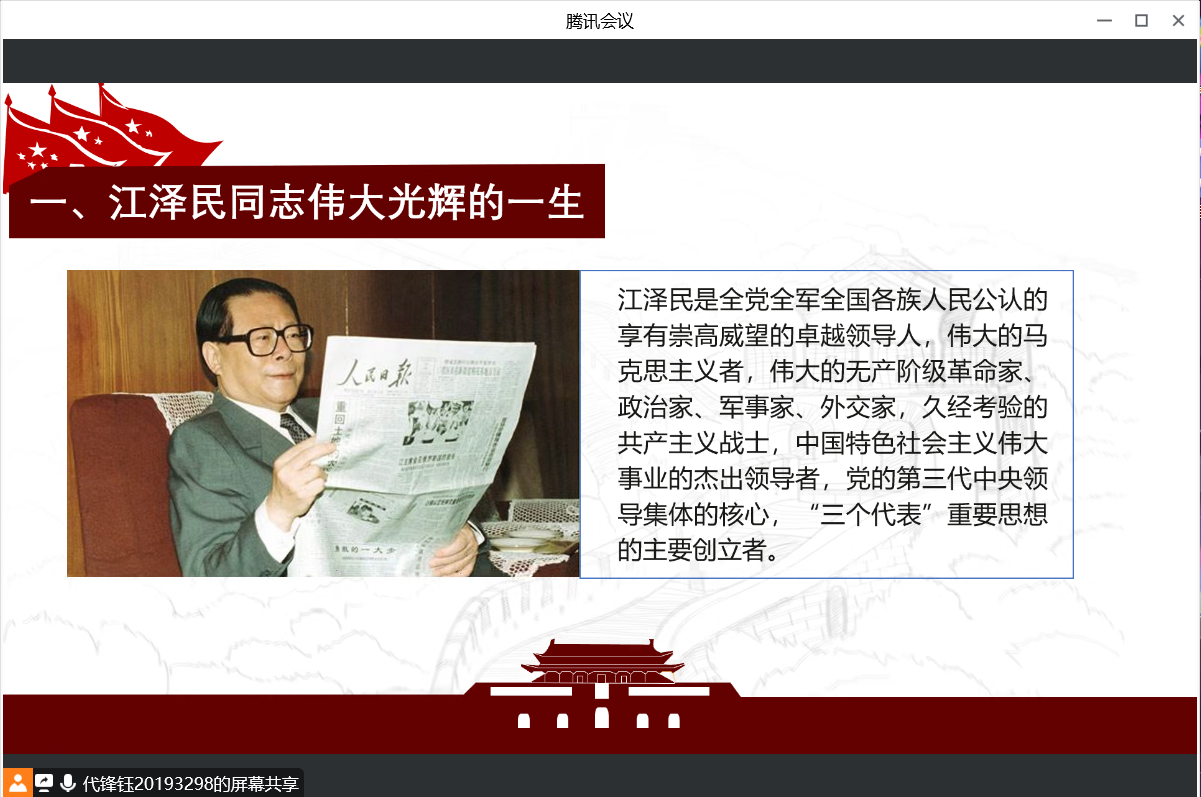 2022年12月15日下午,为了弘扬伟大建党精神和延安精神,91黄色网站 本科生一支部通过腾讯会议在线上开展了“不惧时代挑战,共建美好未来”的主题党日活动。本次党日活动由91黄色网站 本科生一支部第五小组成员代锋钰同志主持,本科生一支部全体党员参加。本次党日活动主要由两个部分组成:一是深切缅怀江泽民同志;二是弘扬伟大建党精神和延安精神,为实现党的二十大提出的目标任务而团结奋斗。图1 回顾江泽民同志的一生会...