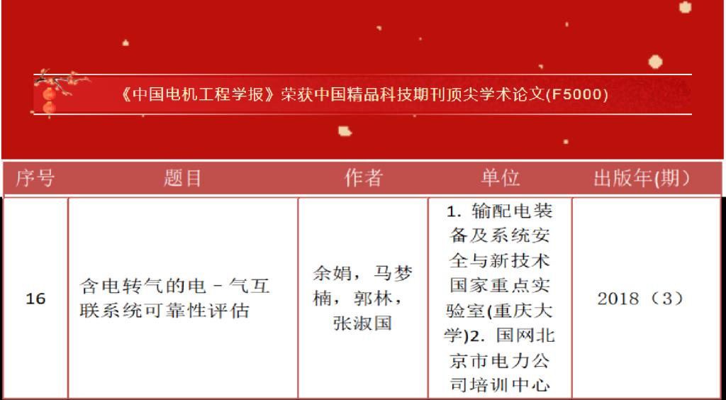 热烈祝贺我院余娟教授撰写的文章《含电转气的电-气互联系统可靠性评估》入选“中国精品科技期刊顶尖学术论文(F5000)”(以下简称“F5000”)!体现了该研究成果在国内的高影响力和学术价值。F5000是由科技部发起的,目的是进一步推动我国科技期刊的整体水平,更好地宣传和利用我国的优秀学术成果,推动更多的科研成果走向世界,参与国际学术交流,扩大国际影响,起到引领和示范的作用。F5000由中国科学技术信息研究所利用科学...