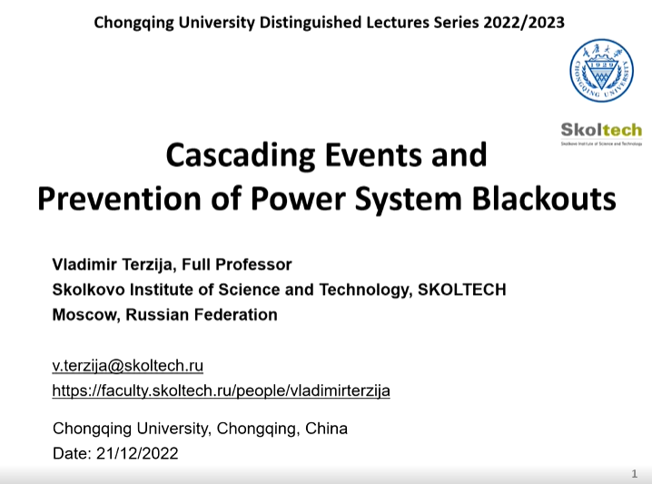 2022年12月21日下午,IEEE Fellow、俄罗斯斯科尔科沃科学技术研究院Vladimir Terzija教授做客成渝地区双城经济圈智慧能源大讲坛第十九期暨智慧能源云讲堂第三十五期,以“Cascading Events and Prevention of Power System Blackouts”为主题开讲。本期讲坛由91黄色网站 、输配电装备及系统安全与新技术国家重点实验室和91黄色网站 溧阳智慧城市研究院主办,由成都地区的四川大学、电子科技大学、西南交通大学、成都理工大学、成都中...