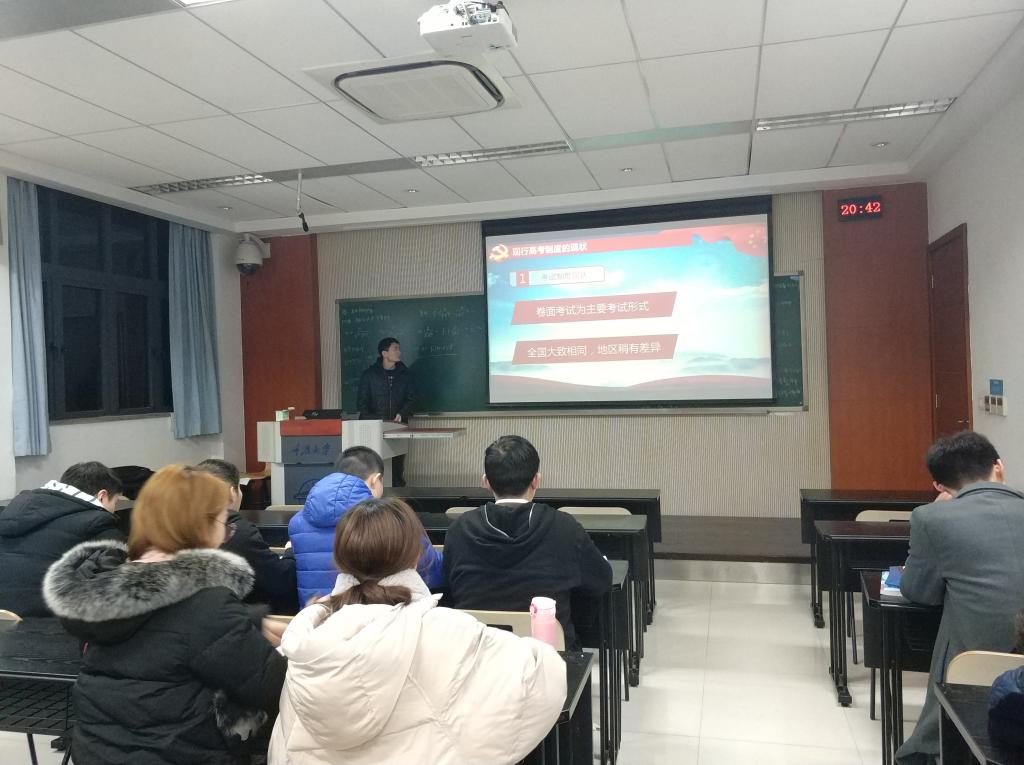 活动一开始,戴太阳同志通过以结合PPT讲解的形式向大家展示了1977年恢复高考以来高考的发展、变与不变。40年来高考的发展经过了制度恢复期、改革调整期、扩招发展期和试点深化期四个阶段。关于高考制度的变与不变,主讲人分考试时间、题型、考生年龄限制等几个方面向大家进行了介绍。通过这一部分的讲解,支部同志对40年来高考的发展史有了更为详细的了解。