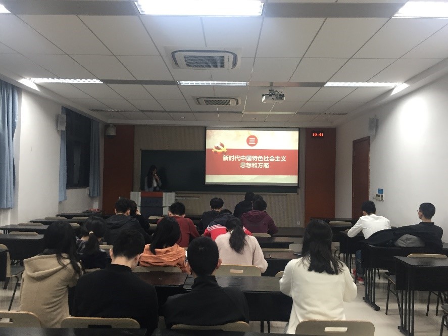 首先赵晓焱同志引领大家回顾了过去五年的工作和历史变革。十八大以来的五年是党和国家发展进程中极不平凡的五年,在复杂的国际国内形势下,我们坚持稳中求进,迎难而上,在经济建设、法制建设、思想文化建设、军队建设、生态文明建设、党的建设等方面取得了重大突破,推动党和国家事业发生历史性变革。由此,党中央作出了两个重大判断:中国特色社会主义进入了新时代,我国社会主要矛盾已经变为人民日益增长的美好生活需要和不平衡不充分的发展之间的矛盾,但是这并没有改变中国的基本国情。于是赵晓焱同志阐释了新时代中国共产党的历史使命。实现中华民族伟大复兴一直是近代以来中华民族最伟大的梦想,为此我们必须不忘初心、牢记使命,坚持进行伟大斗争、建设伟大工程、推进伟大事业。党的十九大将习近平新时代中国特色社会主义思想写入党章,这是对马克思列宁主义、毛泽东思想、邓小平理论、“三个代表”重要思想、科学发展观的继承和发展,是马克思主义中国化的最新成果,必须长期坚持和不断发展。此外,十九大开启了全面建设社会主义现代化国家的新征程,从二〇二〇年到本世纪中叶分成“两步走”战略,逐步把我国建成富强民主文明和谐美丽的社会主义现代化强国。