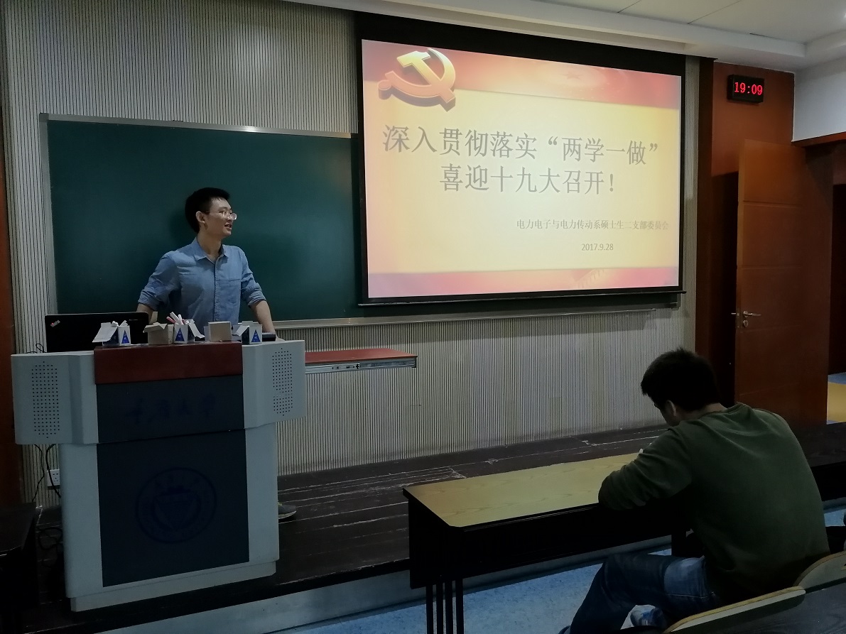 电力电子与电力传动硕士生第2支部在八教202室举行了“深入贯彻落实‘两学一做’,喜迎十九大召开”主题活动。参加本次组织生活会的有正式党员13人。大会由2支部党支书张君主持。