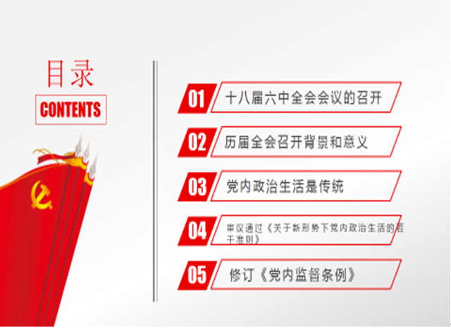 本次专题学习首先简要介绍了十八届六中全会召开的意义、历届全会的背景及意义、党内生活的传统。然后就习近平总书记在党的十八届六中全会上的重要讲话精神和《关于新形势下党内政治生活的若干准则》、《中国共产党党内监督条例》进行了深入的学习。