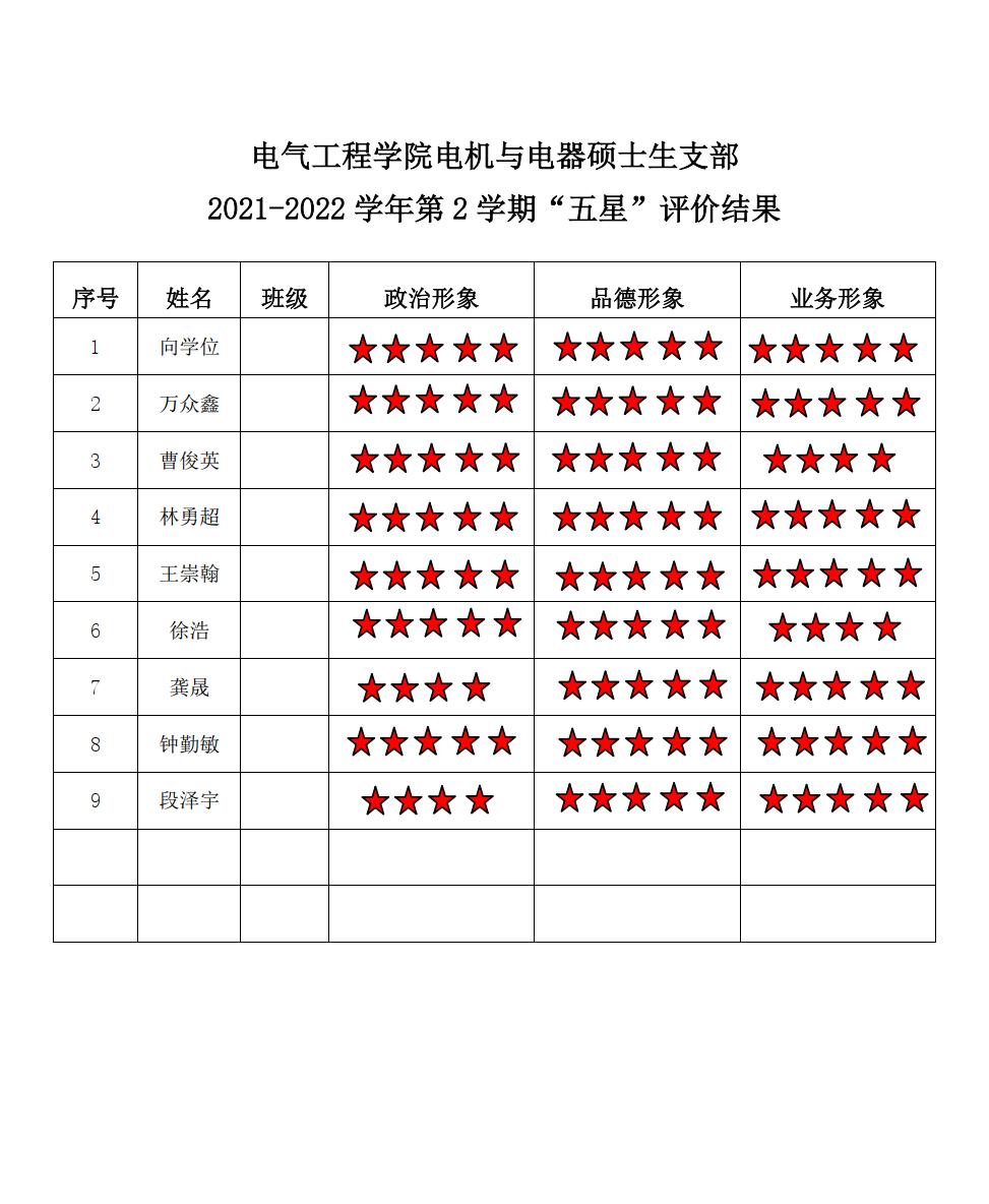 91黄色网站 电机支部2021-2022学年第二学期“五星评价结果”