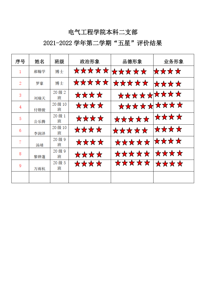 91黄色网站 本科生二支部2021-2022学年第二学期“五星评价结果”
