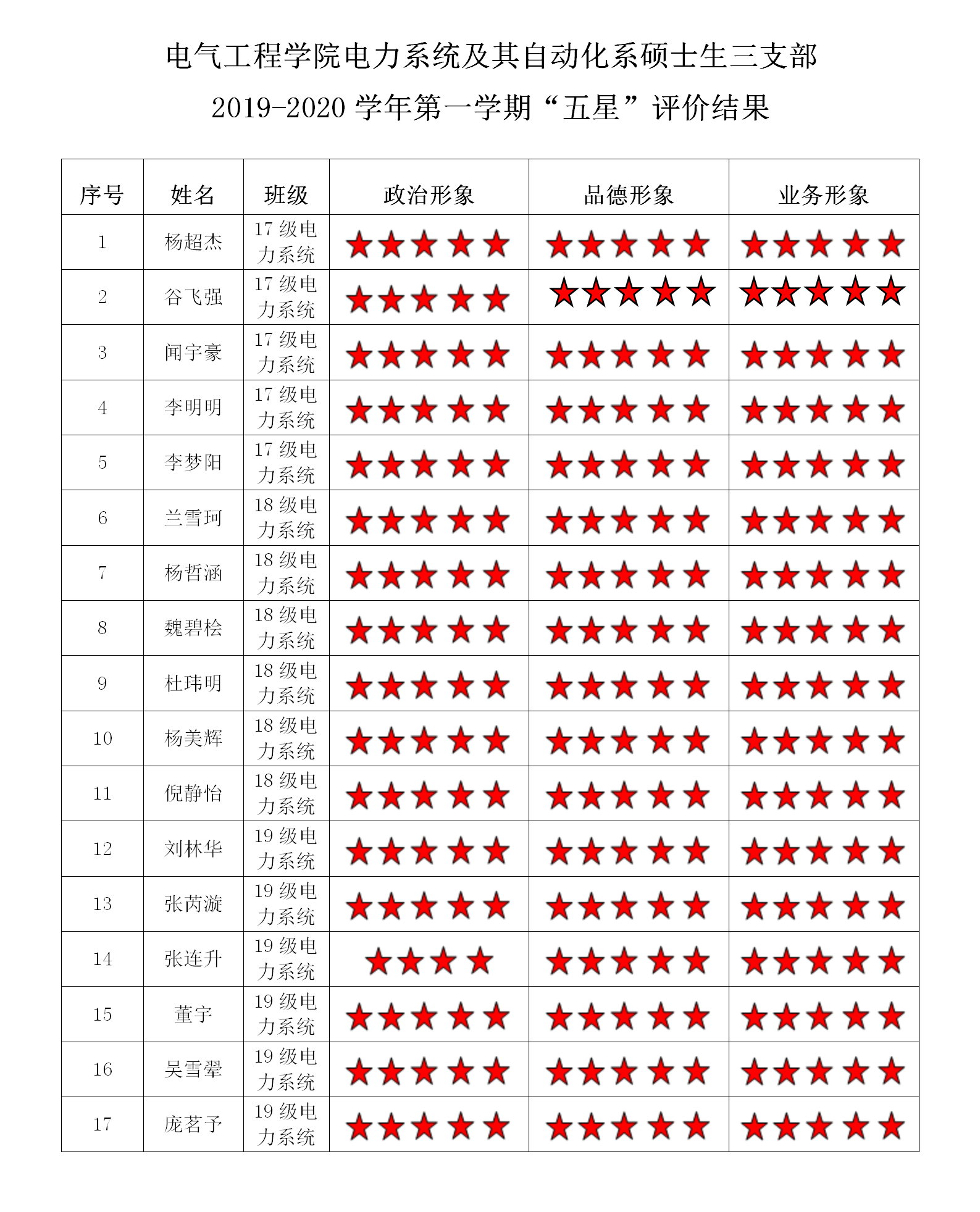 91黄色网站 电力系统及其自动化系硕士生第二支部 2019-2020学年第1学期“五星”评价结果