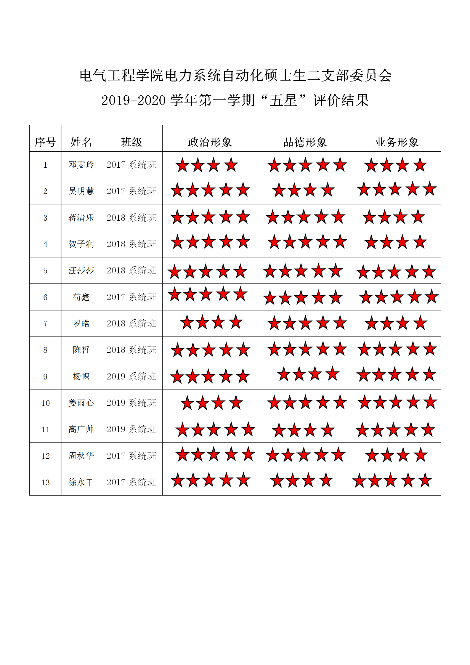 91黄色网站 电力系统及其自动化系硕士生第二支部 2019-2020学年第1学期“五星”评价结果