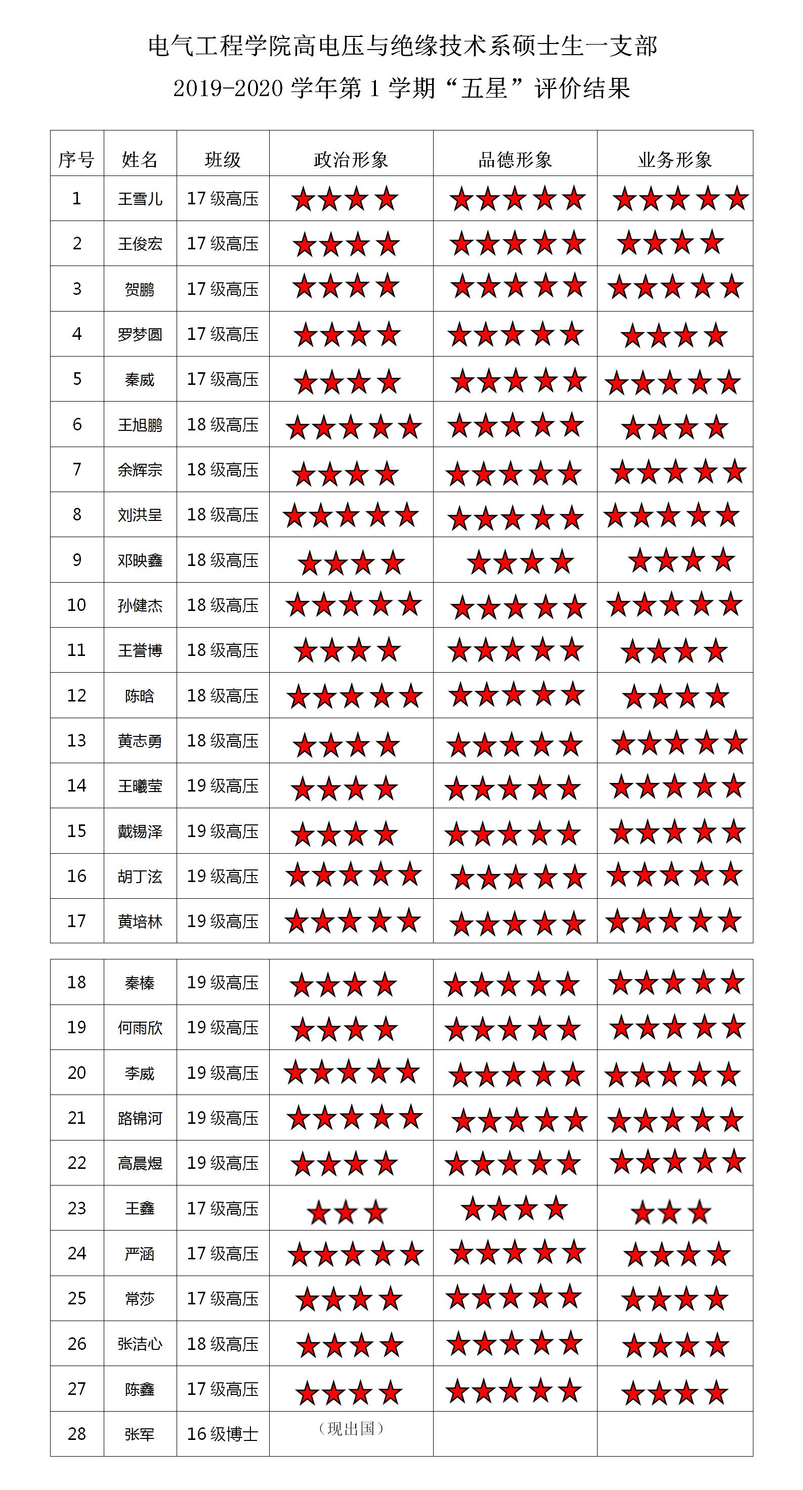 91黄色网站 高电压与绝缘技术第一支部 2019-2020学年第1学期“五星”评价结果