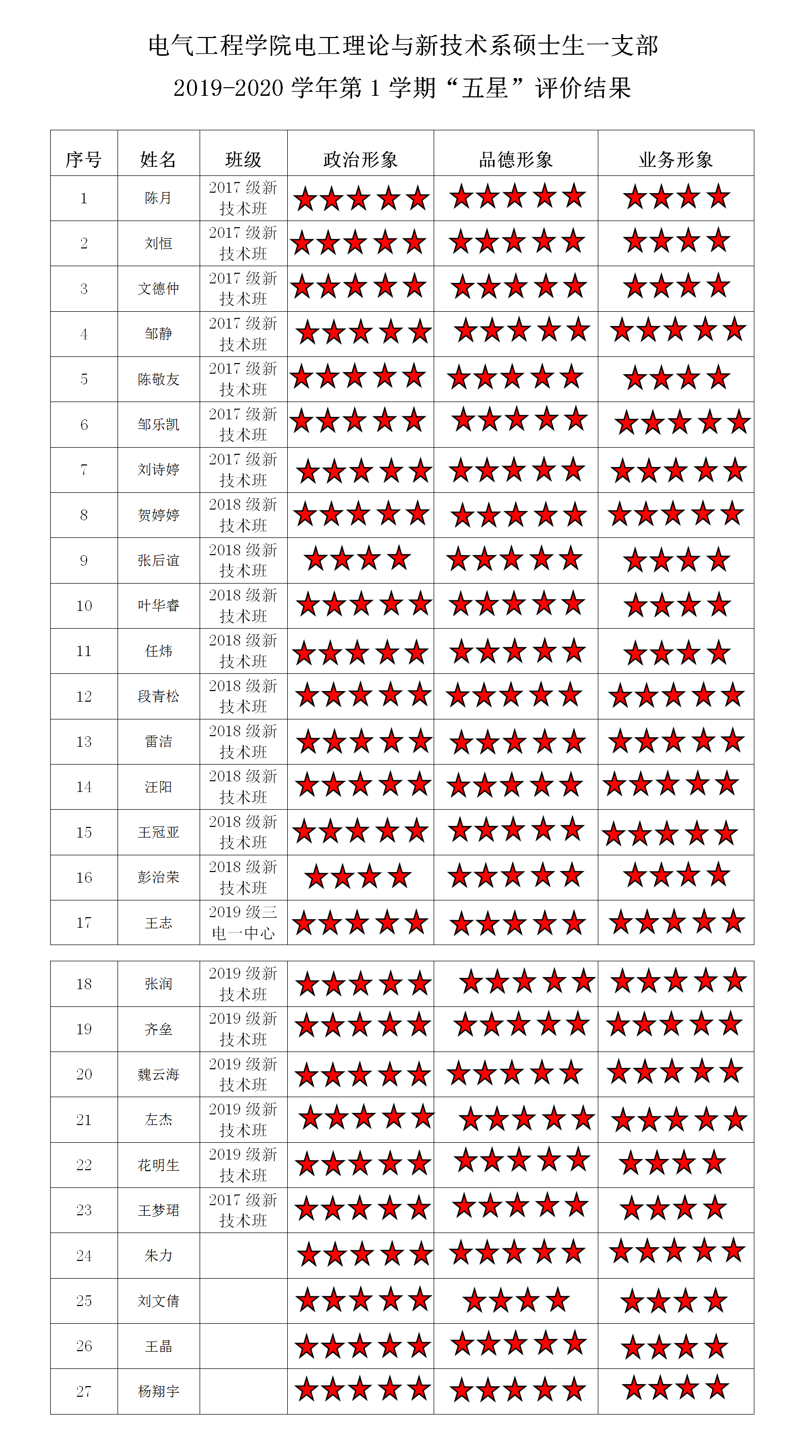 91黄色网站 电机与电器系硕士支部 2019-2020学年第1学期“五星”评价结果