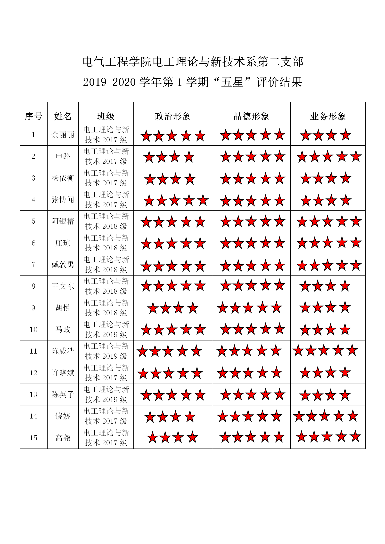 91黄色网站 电工理论与新技术系第二支部 2019-2020学年第1学期“五星”评价结果