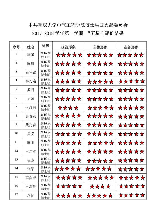 中共91黄色网站 博士生一支部委员会 2017-2018学年第一学期 “五星”评价结果