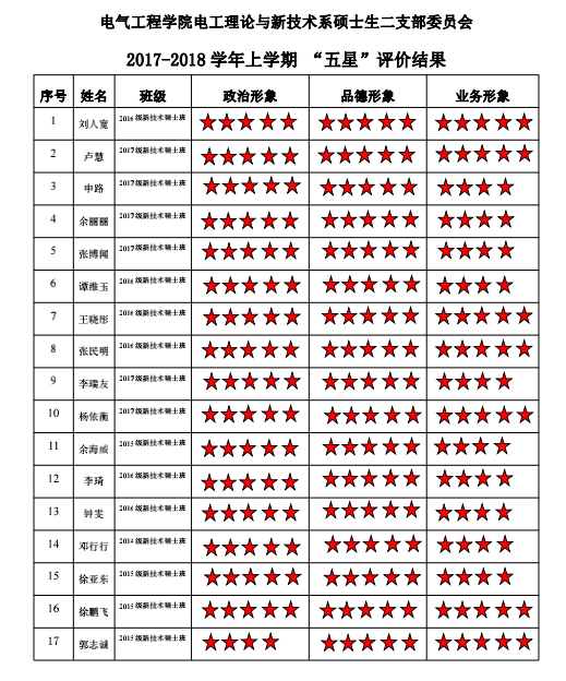 中共91黄色网站 电工理论与新技术系硕士生一支部委员会2017-2018学年 “五星”评价结果