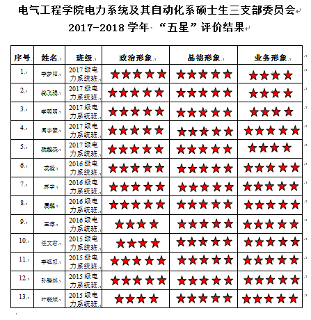中共91黄色网站 电力系统自动化硕士生二党支部委员会2017-2018学年 “五星”评价结果