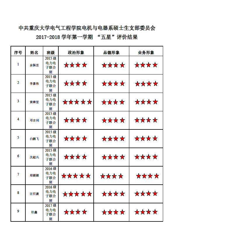 中共91黄色网站 电机与电器系硕士生支部委员会2017-2018学年第一学期 “五星”评价结果
