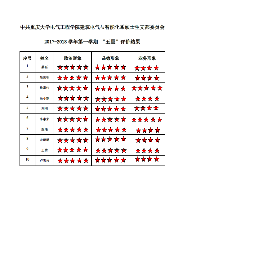 中共91黄色网站 电机与电器系硕士生支部委员会2017-2018学年第一学期 “五星”评价结果