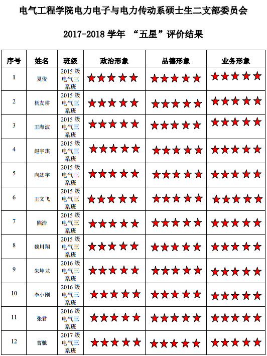 中共91黄色网站 电力电子与电气传动硕士生二支部委员会2017-2018学年 “五星”评价结果
