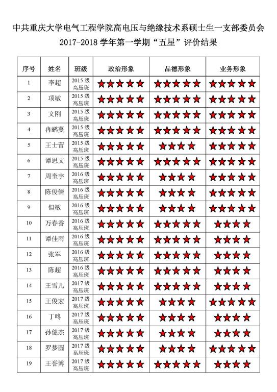 中共91黄色网站 高电压与绝缘技术系硕士生一支部委员会 2017-2018学年第一学期“五星”评价结果