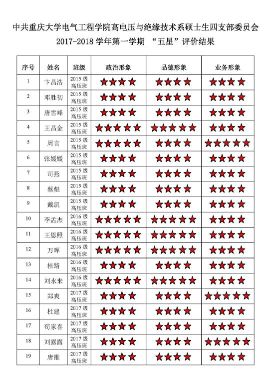 中共91黄色网站 高电压与绝缘技术系硕士生三支部委员会 2017-2018学年第一学期“五星”评价结果