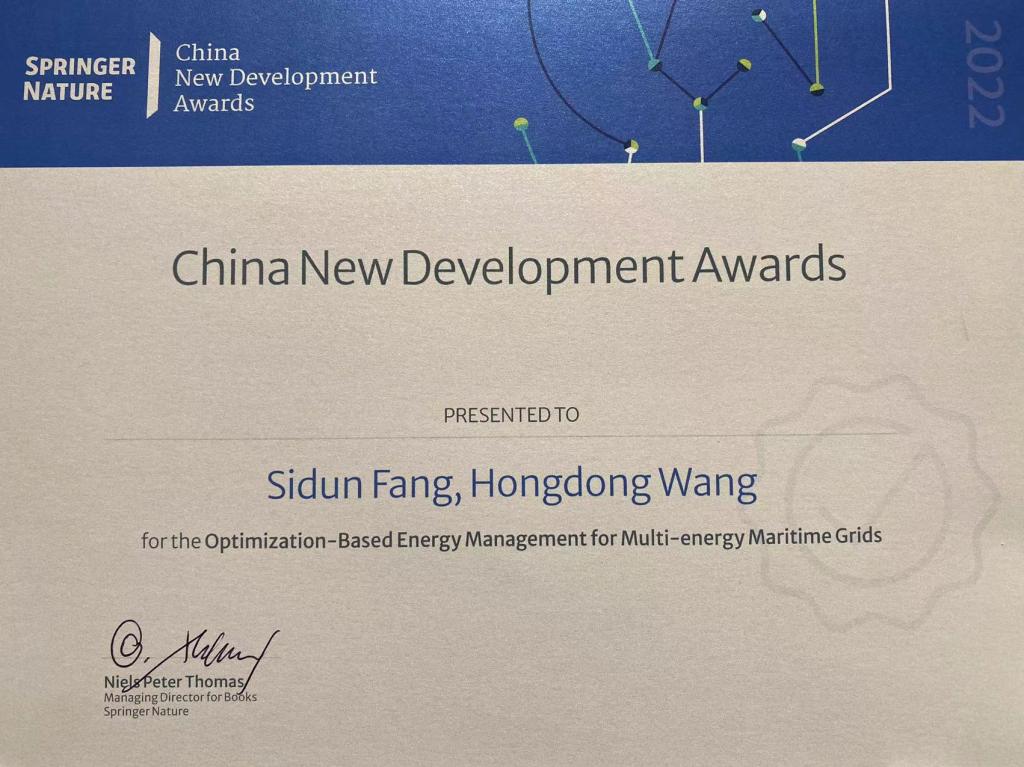 方斯顿教授撰写的英文学术专著《Optimization-based Energy Management for Multi-energy Maritime Grids (基于优化的多能源海上电网能源管理)》作为能源领域唯一代表荣获此项大奖。