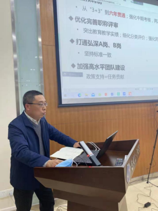 院党委书记胡建林首先传达了学校2022年春季干部大会精神,从党的建设、顶层设计、人才培养、学科建设、科学研究、队伍建设、开放合作、条件保障等八个方面介绍了学校2021年工作情况及亮点工作,并传达了学校下一步改革思路及2022年工作部署。胡建林指出2022年学校将按照“重内涵、强特色、提质量、创一流”的思路,坚持质量为王,强化质量意识,聚力奋进新征程、担当新使命、开启新改革、推动新发展。