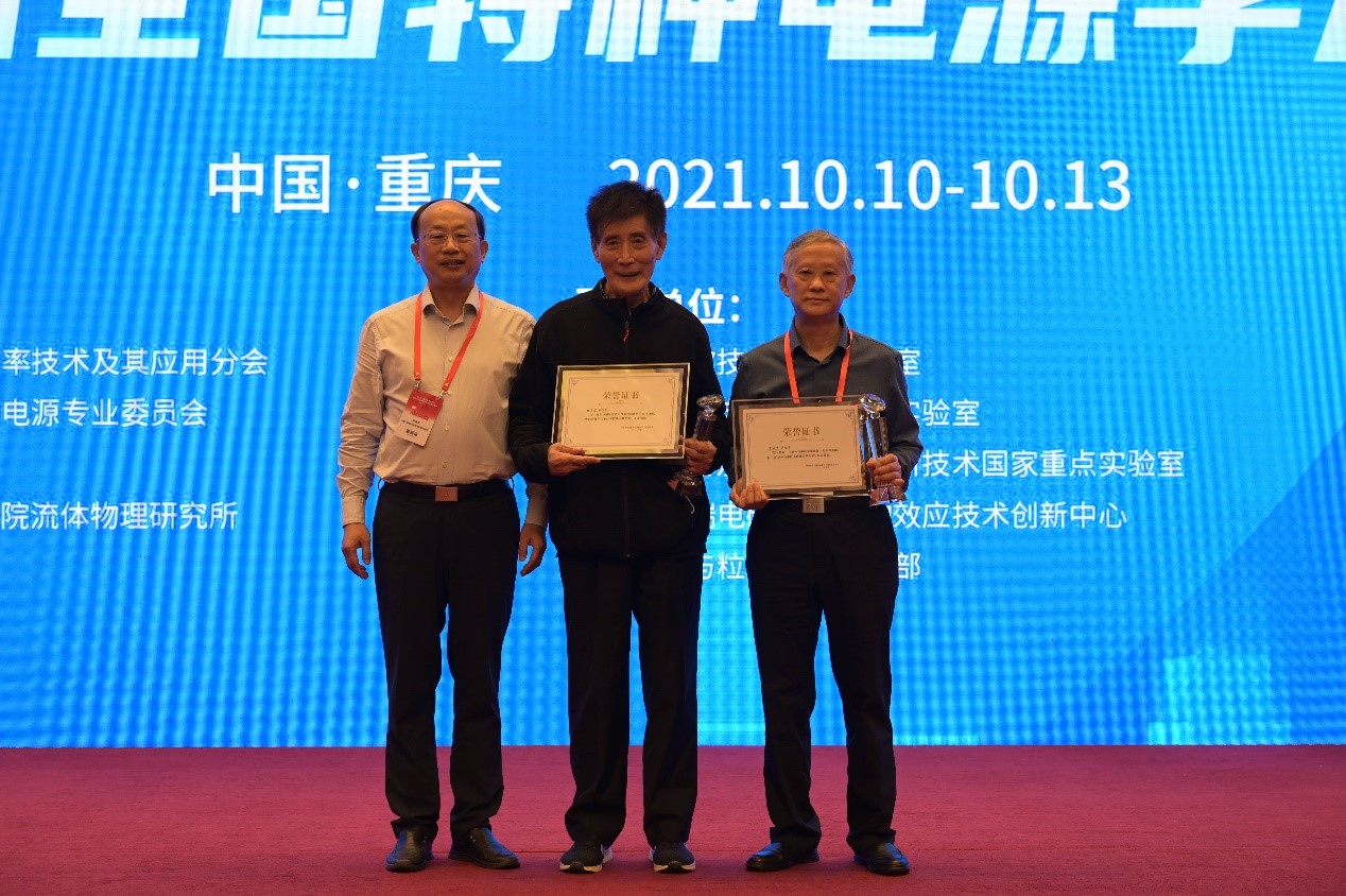 本次会议还进行了脉冲领域“突出贡献专家”和“代表性科技进展”的遴选。“突出贡献专家”是脉冲功率及其应用分会从2011年开始设置的专家荣誉,旨在对我国脉冲功率学科作出重要贡献、在国内同行中具有很高认可度的专家进行遴选和荣誉性表彰。候选人需经学会理事提名、理事会审议通过,当选人员在全国脉冲功率会议期间进行表彰,每届不超过2名。本届当选专家为中物院流体物理研究所张恩官研究员和西北核技术研究所曾正中研究员,彭先觉院士、邱爱慈院士、邓建军院士为两位专家颁发了纪念奖杯和证书。会议还在前期个人申报和专家函评基础上,通过理事会会议评选了过去两年中我国脉冲功率和特种电源领域的1项杰出科技成果和7项代表性科技进展。我校电气学院姚陈果教授团队研究成果入选代表性科技进展,核学会脉冲功率技术及应用分会石金水理事长在大会闭幕式上为作者团队代表颁发了证书。