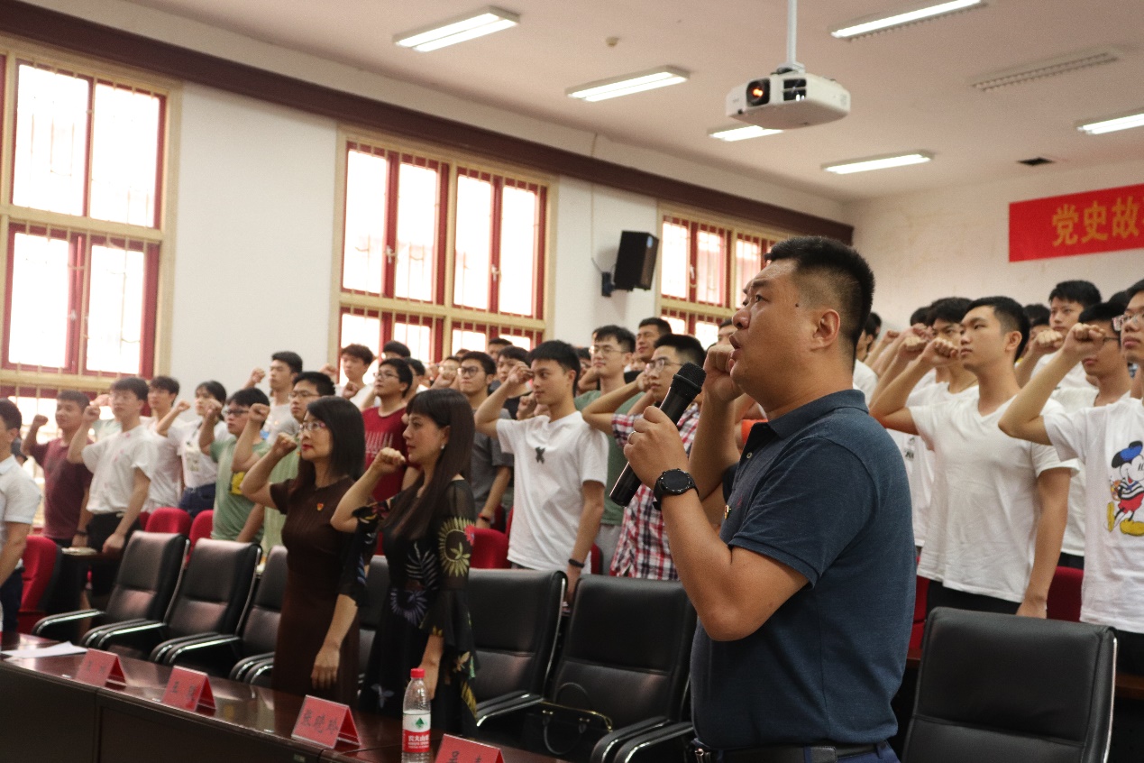 会议的最后,吴嘉带领全体参会成员重温入党誓词。“我志愿加入中国共产党,拥护党的纲领,遵守党的章程,履行党员义务……”老师和同学们右拳高举,面对鲜红的党旗,把满腔的热情化作铮铮誓言,一字一句铿锵有力。