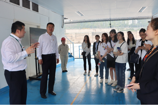 随后,电气师生前往朝天门了解重庆公司“红岩电力先锋”工程——朝天门室内变电站和朝天门11码头港口岸电项目。通过朝天门变电站工作人员的介绍,电气师生对全户内、智能化、大容量的环境友好型110千伏朝天门变电站有了更加深入的了解。在解说员的带领下,电气师生登上停泊在长江上的游轮,深入了解岸电供电有关设备——全国首创的双供电浮趸。为保护母亲河生态,践行绿色低碳生活方式,参与体验的人员在“保护母亲河,聚焦碳达峰、碳中和行动”倡议书上庄重地签下自己的名字。