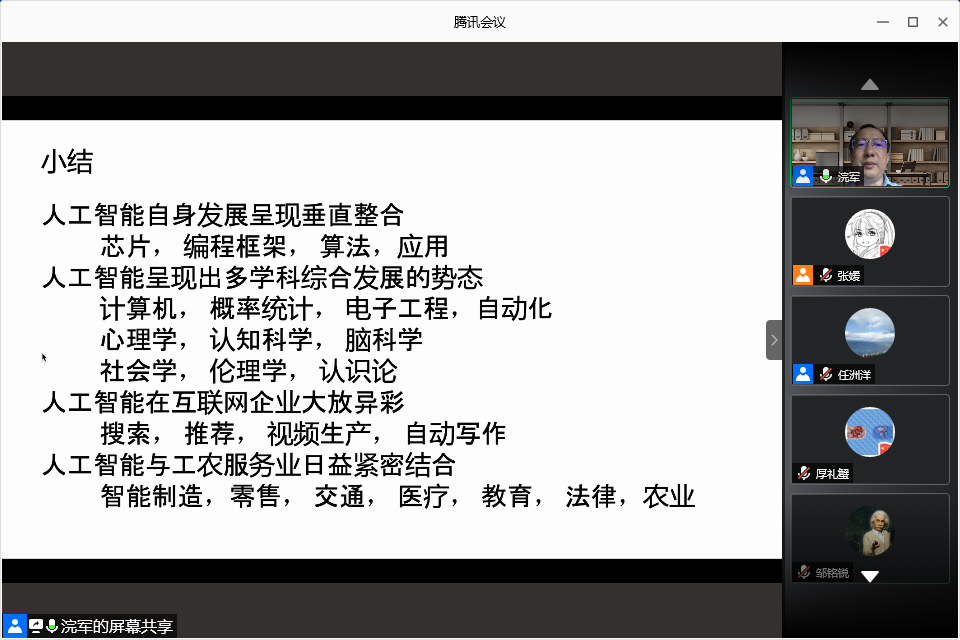 浣军教授从人工智能给人类社会带来的巨大变革引入,整体介绍了人工智能的发展史,分析了当今时代下人工智能的发展现状,并针对领域热点问题对未来发展趋势做出了展望。从1956年诞生到如今的指数式爆发,人工智能领域的研究及创新历经几次“寒冬”的考验,仍然持续增长,不断迸发新的活力。数据的极大积累、算例的迅速提高、深度学习的快速发展为人工智能的成长提供了动力和空间。浣军教授以生动有趣的范例结合详实的数据,着重为同学们讲解了深度学习具有见多识广、举一反三的能力。浣军教授表示,让人工智能具有创造性是当前行业的主要发展方向。
