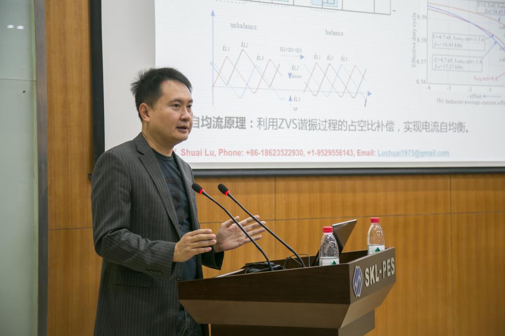 陆帅教授做了专题报告,他的报告题目是:功率变换系统的密度与性能提升中的几项基础技术的探索。陆教授从交流端口电力谐波下的电压型PWM变流器直流端口谐波电流模型、基于ZVC软开关新认识的非隔离交错并联高密度变压器技术和趋近电机控制或变流器动态性能理论极限的电流调节内环技术三个研究方面,提出了功率变换器是电力电子化智能微电网与电机驱动应用的关键组成部分,其功率密度与控制性能的提升是电力电子及电机驱动行业不懈追求的目标,在一系列高性能工业应用的需求下,催化了他们团队近年来在该领域基础技术中的几项研究成果。