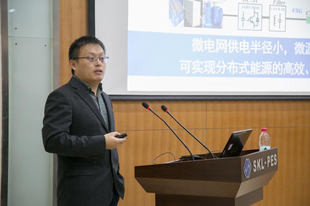 最后,湖南大学帅智康教授就孤岛微电网的电压和频率二次控制方法给同学们做了相关报告,帅教授从研究背景与意义、动态主从控制(DRMSCA)的基本思想和基于DRMSCA的微电网二次控制方法三个方面给同学们详细地讲述了相关课题的研究与成果。