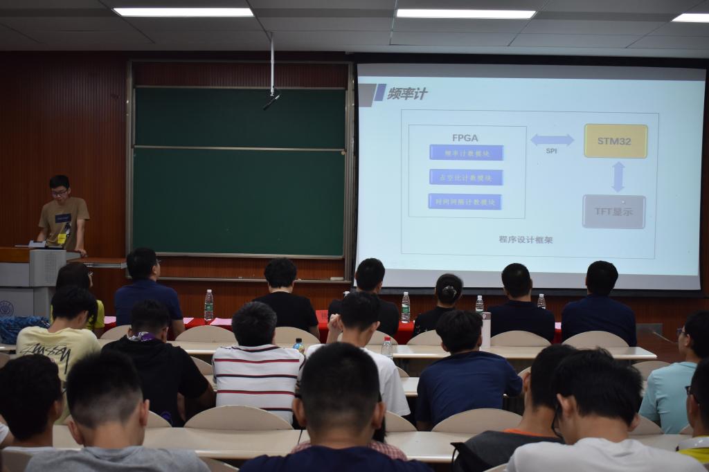 紧接着由本届竞赛一等奖获得者2017级秦海鹏、龙思屹同学进行经验分享。他们分别从硬件与软件角度对他们的作品创造过程进行了解读。从寻找合适的芯片,到抠尽每一处细节的PCB布线;从题目要求入手,发现问题解决问题——整形、倍频,手段层出不穷。他们的经验给所有参赛同学带来了思路上的启发。也体现了他们在竞赛中付出的辛勤汗水,铸成的智慧结晶。