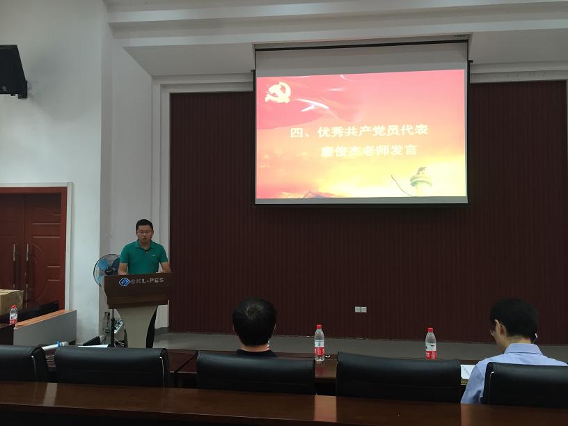 青年教师唐俊杰作为获奖教师代表进行了发言。他首先感谢党组织和同事们对青年教师的信任和工作的肯定。表示作为一名青年党员教师,在亲眼见证学院为了“双一流”建设而做出的努力与改变后,面临严峻的、新的发展形势,要时刻牢记党员应尽的义务和神圣的职责,诲人不倦,耕耘不辍,尽职尽责尽心,把"优秀共产党员"这一殊荣看作是一种鼓励和鞭策,在工作岗位上一如继往,勤勉尽责,发挥先锋模范作用。