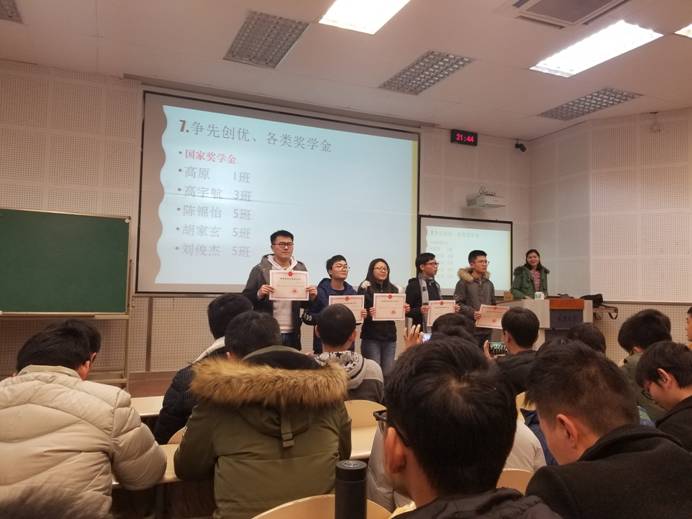 大会第二项议程,由喻老师对班级及个人所获奖项进行了公示及表彰。其中4班表现极佳,斩获校级、院级多个集体荣誉奖项。之后,喻老师对个人获奖情况也进行了表彰,其中陈锦怡等5名同学获得国家奖学金,王兵凯等14位同学获得国家励志奖学金,张奔等同学获得校级及院级争先创优的荣誉。