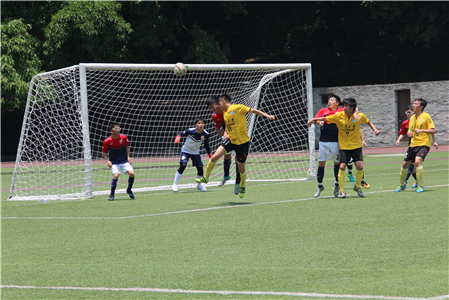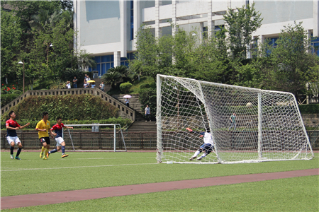 研究生足球联赛淘汰赛次轮在A区团结广场展开,比赛双方是电气学院和材料学院。根据分区,本轮电气、国际、材料三支队伍进行单循环比赛,前两名晋级四强。最终,电气学院凭借4号尹潇和9号王耀的进球以3:1战胜材料学院。