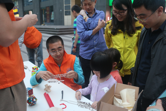 在体验环节,孩子们和社区居民参加了科技趣味实验、交流互动游戏、智力拓展游戏和科技作品体验,主要包括1班“会跳远的乒乓球”和“扑克牌中的铅笔”,2班“你画我猜”和趣味知识竞答,3班拧魔方、解九连环和孔明锁等。