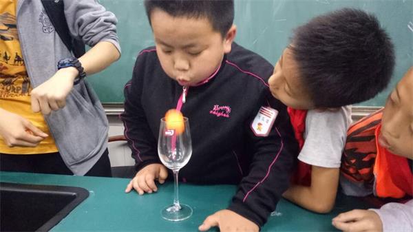 在保家小学,志愿者们大胆地采用了一个新的“教学”形式——让孩子们进行科技比赛。志愿者们将此前为孩子们介绍的关于“流体压强”的知识,巧妙地转化“乒乓球翻越比赛”,即如何令乒乓球从一个杯子中快速地吹到另一个杯子中。在介绍完比赛所运用的相关知识后,志愿者们将各班同学分为四组,让孩子们通过合作的形式进行一分钟的比赛。比赛伊始,同学们均热情高涨,积极认真地进行比赛,但是孩子们似乎忘却了老师们所介绍的比赛技巧,而志愿者们也对孩子们进行了提示。很快,孩子们开始理解了其中的科学原理,并将其运用到比赛当中,乒乓球翻越的速度也随之加快,而同学们也在这场愉快又紧张的比赛中将科学知识运用到实际之中,令志愿者们颇为欣慰。此外,志愿者们还进行了“牛顿摆的演示”以及“会隐身的墨水”等实验,激发了孩子们对科学知识兴趣的同时,也真正让孩子们做到学以致用,将科学灵活运用到事实之中。