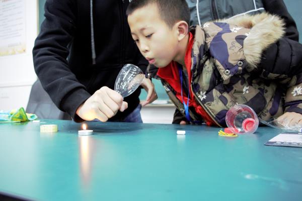 随后,志愿者们以生活中的“水枪”等实例引发同学们的思考,激发同学们的兴趣。在将实例与理论相结合,给同学进行初步讲解,并将孩子们引导到今天的主题“气压和水压”上。接着,志愿者们开始进行“水压与深度的关系的探究”、“有孔纸片拖住水”、“手绢的秘密”、“吹不灭的蜡烛”等趣味实验。志愿者们根据实验现象对知识进行了进一步的说明分析。