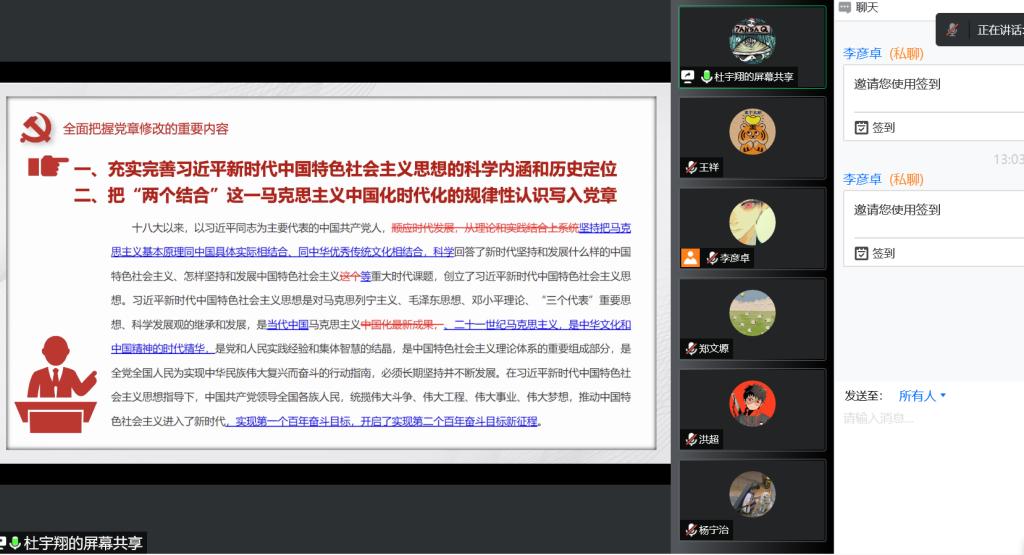 本科生一支部在线上开展了本学期第三次组织生活,本次组织生活以“让党旗在新征程上高高飘扬”为主题,深入学习二十大党章修订案,由杜宇翔同志主持,一支部全体党员参加。