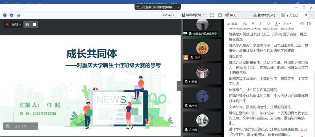 任超老师分享对前几届十佳班级建设的经验和组织大赛的思考。任老师认为,十佳班级答辩应讲述属于自己班级的故事,按照建设理念、建设方案、方案实施建设成效、建设收获与启迪这一条逻辑线展开,讲出各个班在学习、生活、精神等方面的特色和风采。本次活动的主题是“青春献礼二十大”,参赛班级应紧扣主题,将班级展示与时代任务紧密结合,展现出当代青年学子的使命担当和家国情怀。他指出,决赛的展示应弘扬正能量,着力体现大一新生的大学适应性、帮扶——互助成长(个人到集体)、师生、生生互助、新生态和班级向心力。希望各班深入探究班级大赛背后的意义,提升班级凝聚力,通过大赛挖掘每一位班级成员的优势和亮点,并构建班级新的生长点和融合点。