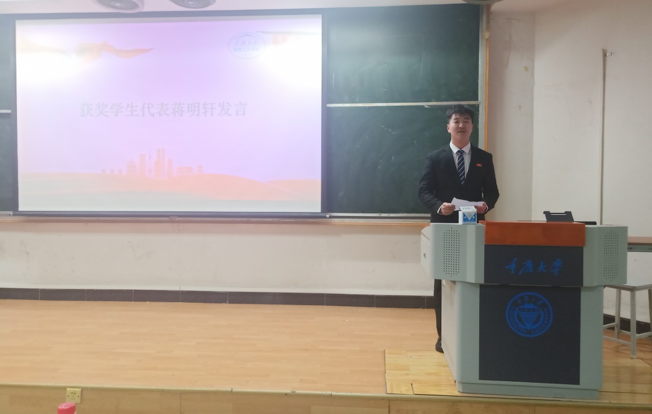 2019级本科生蒋明轩同学代表获奖学生发言。蒋明轩在发言中表示,特高压电网奖学金的设立,不仅让自己感受到了国家电力行业给予我们的关怀,也激励自己以更加饱满的热情、更加积极的态度努力学习、奋发向上,并表示将在特高压精神的引领下,脚踏实地,超越自我,用实际行动为我国电力事业贡献一份力量。