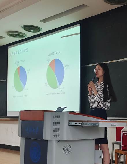 随后,胡力方老师就同学们之后的安排做了详细的介绍。临近大三期末,同学们都有对自己未来的规划,胡老师从保研、考研和就业三个方面的近两年形势做了详细的分析,就前两年的毕业生去向看,仍然是就业和境内升学占主要部分。对于本学院同学,保研大多是留在本校,其余多数去了华中科技大学和西安交通大学,考研的同学留本校的也居多。就业方面,老师重点强调了就业前大家对就业信息的了解和个人简历的制作,特别是有意向电网的同学,需要做到全面了解电网招聘流程和规则。她提醒同学们,如今大家正面临人生的转折点,希望大家做好选择,并为之努力。