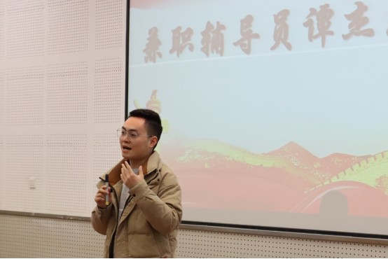 兼职辅导员谭杰上台发言。在谈到参与本次活动的感受时,他首先肯定了用评书分享英雄故事的新颖活动形式,对参评原创作品的文学价值和思想内涵表示了赞赏。同时他也点明了积极参与团日活动、加强思想政治学习的意义所在,强调了当代青年传承红岩精神、牢记历史使命的重要性。