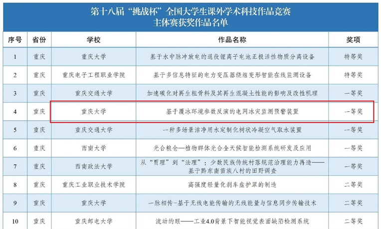 经过激烈的网络评审、现场展示、线下路演答辩等环节,由我院杨国林、郑华龙、蒋兴良指导,刘琳、牛思源、胡松林、石诗义、马龙飞、丁江毅等同学负责的项目《基于覆冰环境参数反演的电网冰灾监测预警装置》喜获第十八届“挑战杯”全国大学生课外学术科技作品竞赛全国一等奖。