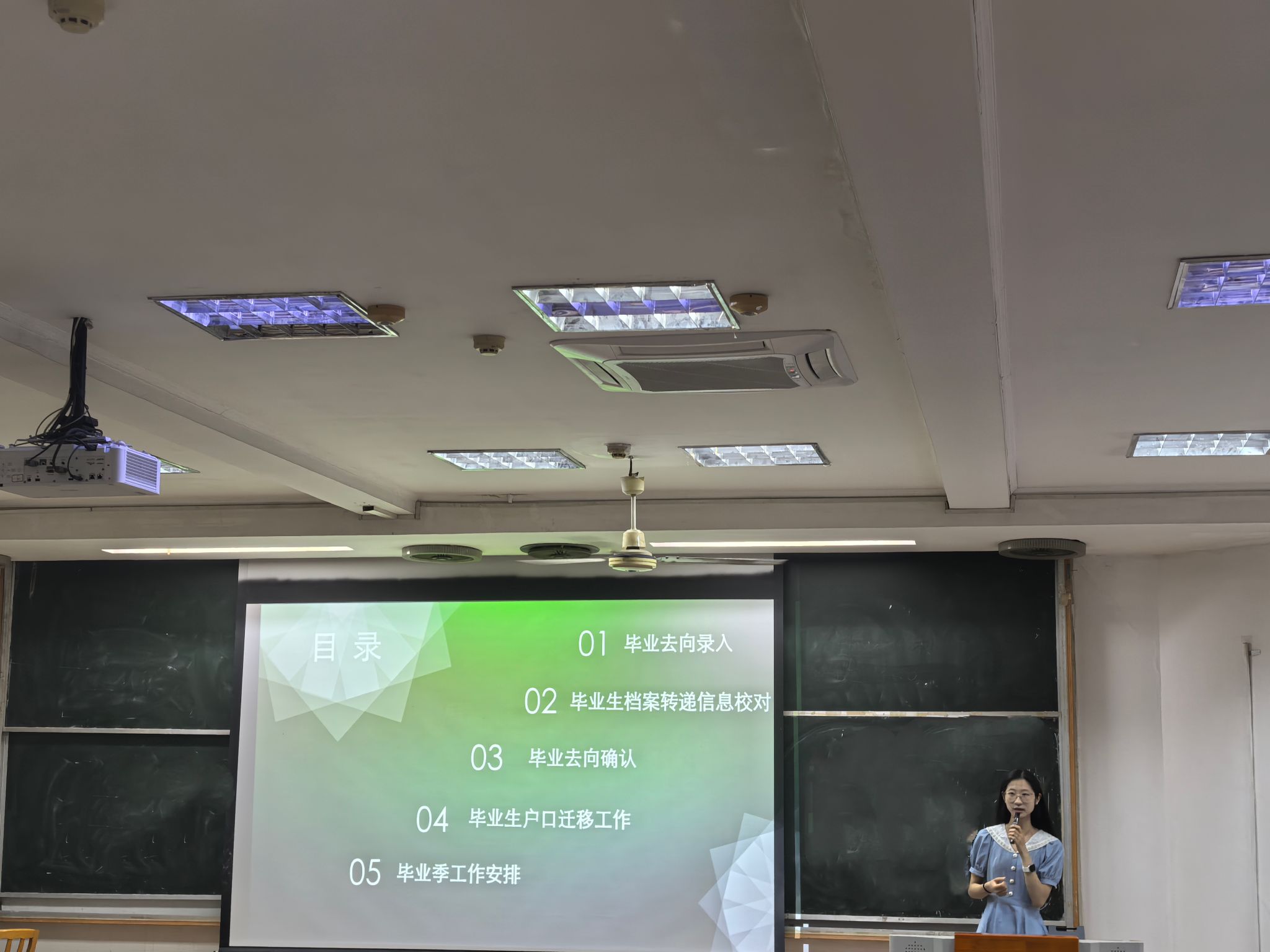 会议伊始,胡力方从毕业去向录入、毕业生档案转递信息校对、毕业去向确认、毕业生户口迁移工作以及毕业季工作安排五个方面展开梳理了毕业生在离校前需要完成的一系列工作,方便同学们更顺利地处理毕业季相关事务。去向登记是全体毕业生必做之事,她提醒同学们尽快完成学校系统中的去向录入、及时进行全国系统上的去向确认。人事档案与本人一生息息相关,她通过较长篇幅并配有就业系统的操作界面截图,对档案怎样投、何时递、如何查等事项做出了逐步说明。户口迁移为部分对象的选择需求,她特别强调了同学们需提前确认所在地能不能接收户口、以什么样的方式接收户口等问题。
